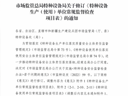 為貫徹落實(shí)《特種設(shè)備生產(chǎn)單位落實(shí)質(zhì)量安全主體責(zé)任監(jiān)督管理規(guī)定》(市場(chǎng)監(jiān)管總局令第73號(hào))、《特種設(shè)備使用單位落實(shí)使用安全主體責(zé)任監(jiān)督管理規(guī)定》(市場(chǎng)監(jiān)管總局令第74號(hào))進(jìn)一步推動(dòng)特種設(shè)備安全主體責(zé)任落實(shí)落細(xì),經(jīng)商總局辦公廳同意,決定對(duì)《市場(chǎng)監(jiān)管總局辦公廳關(guān)于實(shí)施<特種設(shè)備安全監(jiān)督檢查辦法>若干問題的意見》(市監(jiān)特設(shè)發(fā)(2022)59號(hào),以下簡(jiǎn)稱《意見》)進(jìn)行修訂。調(diào)整內(nèi)容為《意見》附件1《特種設(shè)備生產(chǎn)單位常規(guī)監(jiān)督檢查項(xiàng)目表》、附件2(2-1、2-10、2-11)《特種設(shè)備使用單位常規(guī)監(jiān)督檢查項(xiàng)目表》(調(diào)整后內(nèi)容見本通知附件1附件2),其余內(nèi)容不變,請(qǐng)認(rèn)真貫徹執(zhí)行。