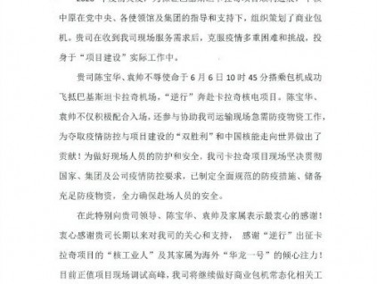 中核集團(tuán)為東南電梯發(fā)來的感謝信,感謝“逆行”出征卡拉奇項(xiàng)目的“核工業(yè)人”及其家屬為 海外“華龍一號(hào)”的傾心注力!感謝東南電梯為中國(guó)核電走向世界做出了...[詳情]